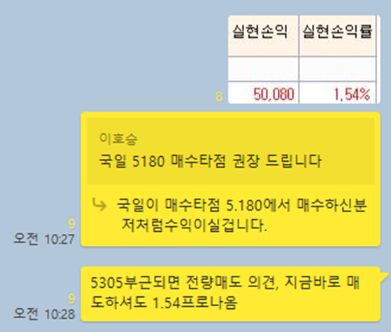 저는 피봇1차저항까지는 오를꺼라 예상은 하였지만, 금일 새로이 발굴한 종목 매매를 위해 시초가 장시작하고 매도하여 약 1~2%사이에 수익을 실현하였습니다.