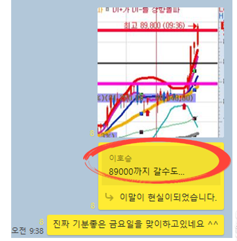 제가 이 종목은 너무 빨리 매도하여 너무 아쉬운데… 정신차리고 차분히 보니 매도타점에 대한 저항이 보였습니다. 89000원까지 갈수도 라는 이야기를 했는데..