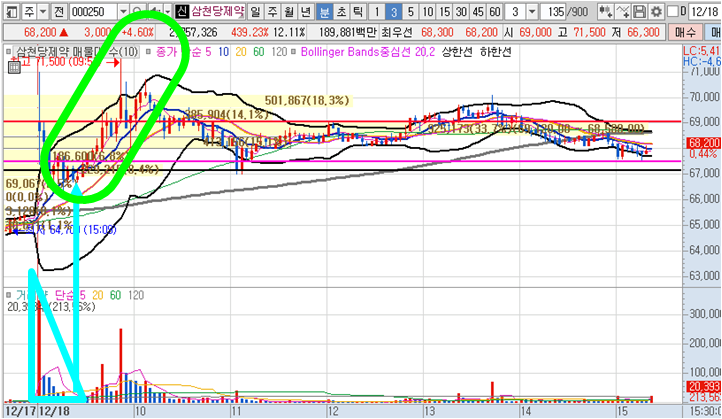 인콘 3분봉 입니다. 장전예상종목으로 갭상승출발이후 일시적으로 볼린저밴드 하단까지 하락했지만 지속적으로 상승하여 11시 21분에는 최고점인 4335원까지 상승하며 9%이상 상승하였습니다. 그 당시 20일 매수타점으로 접근시 매수후 20분안에 큰 수익이 발생하였을 것 입니다.