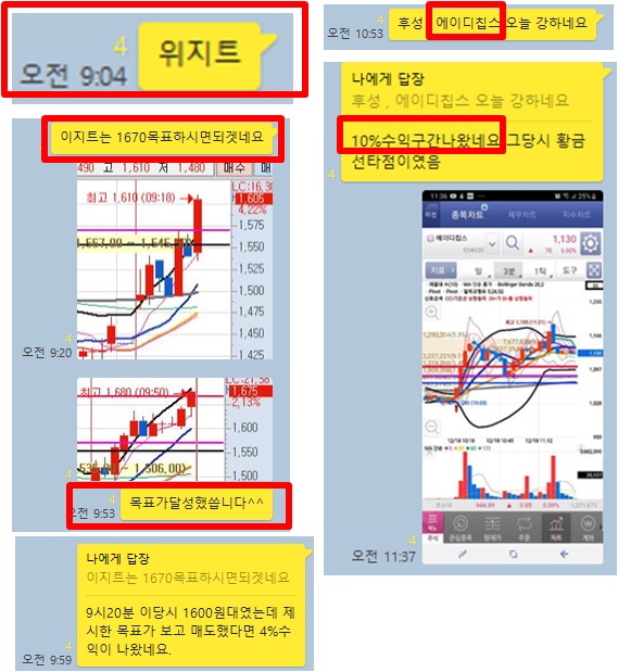 오늘은 장전예상 종목 2개와 공략종목 1+1개를 선정하였습니다. 특히 2일전 종가배팅으로 24200원에 추천한 명신산업이 2일연속으로 상한가에 진입하며 홀딩한 분은 60%이상의 수익이 발생하였습니다. 또한 오늘의 공략종목 또한 “유효한 매수타점”에서 수익이 충분히 발생할 수 있었습니다. 그럼 카카오톡 대화내용과 차트를 보면서 설명드리겠습니다.