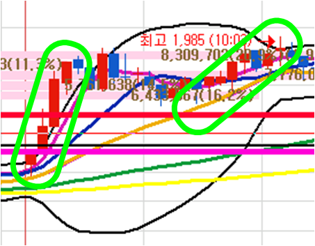 삼화네트웍스 3분봉 입니다. 오늘의 시초가 공략종목으로 첫번째 캔들 최고점을 2번째 캔들이 돌파시에 따라들어가며 단 3분만에 4%이상의 수익을 실현할 수 있었던 종목입니다. 게다가 10일선 눌림목에서도 양봉4개가 나오면서 알고있었던 지식을 바탕으로 정석적인 수익이 2번이 나왔으며 돌파시 홀딩하고 최고점 매도시에는 13%의 수익이 발생할 수 있었던 당일 수익내기 좋은 종목이였습니다.