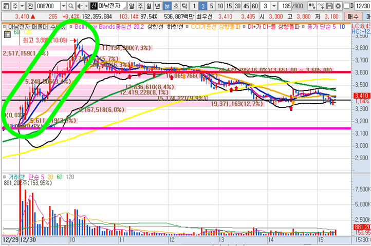 아남전자 3분봉 입니다. 전일 공략종목으로 전일 상한가 진입이후에 다음날에도 장시작후 1시간이상 급등이 나오면서 만약 홀딩시 2일만에 50 %이상의 수익률도 가능했던 대박 종목이였습니다.