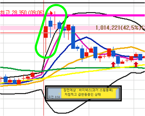 바이넥스 3분봉 입니다. 장전예상종목으로 갭상승출발이후 볼밴하단까지 눌림이 나온이후 전일고점까지 상승을 하긴 했지만 그 이후에는 지지해야할 곳을 지키지 못하면서 오늘은 오전에 수익내기 어려웠던 종목입니다.