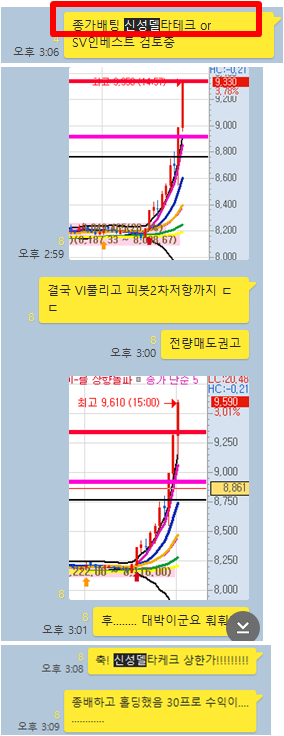 신성델타테크 3분봉 입니다. 전일 종가에 종가배팅 후보로 선정한 종목으로 다음날 갭상승은 나오지 않았지만 120일선을 지속적으로 지지하며 장 막판에 단 30분여만에 급등하며 순식간에 상한가에 진입한 놀라운 대박 종목이였습니다.