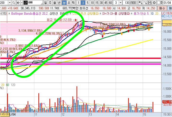 HMM 3분봉 입니다. 시초가 검토하다가 공개하지 않은 종목인데 보시는 차트 처럼 10일선 매수타점에서 오전내내 상승하면서 20%이상 급등이 나왔었습니다. 이 보석같은 종목을 공개하지 않은 점은 굉장히 아쉬웠습니다.