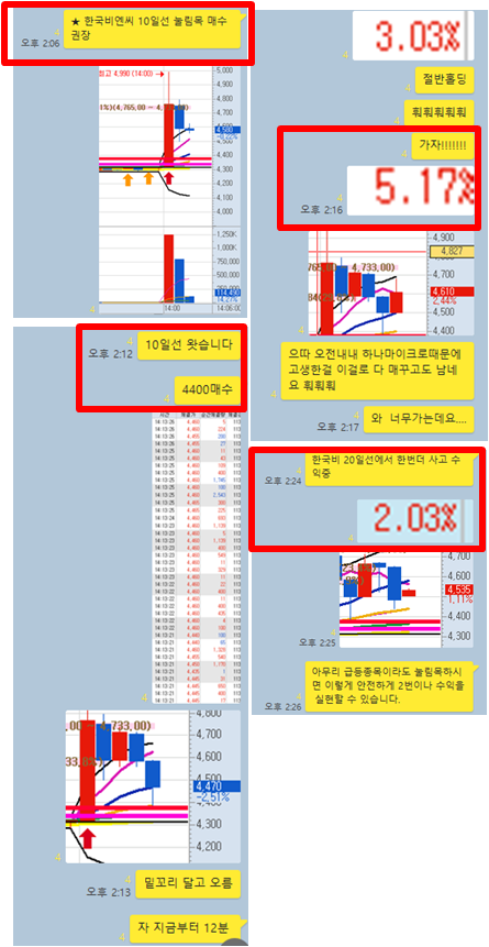 한국비엔씨 3분봉 입니다. 오후 급등 종목으로 급등후 눌림목 공략을 위해 처음부터 10일선 지지여부를 확인하고 매수 권장한다 라고 이야기 이후로 10일선이 깨지고 20일선 지지하는 구간인 4400원에 매수를 진행하며 단 4분만에 5%이상의 수익을 실현하고 20일선에서 한번더 잡아 2%수익을 실현했으니 총 2번 있엇던 종목 입니다. 이렇게 바로 반등이 나와줘야만 하는 자리에서 기다렸다가 제대로 반등을 먹고나오면 됩니다.