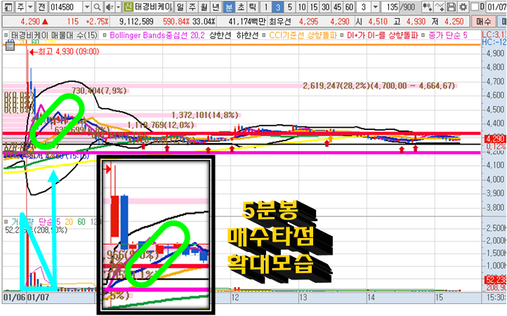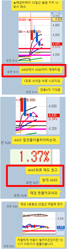 태경비케이 3분봉 입니다. 오늘의 시초가 공략종목으로 시초가 큰 갭상승이후 급락이 나온후 10일선 매수타점에서 처음 공개하며 1~2%수익구간이 나왔던 종목으로 매수타점은 상기 보이는 차트와같습니다. 절반 먼저 수익 실현후 홀딩한 물량은 20일선 지지를 하지 못한다고 판단하여 10시이내 수익으로 종료한 종목입니다.