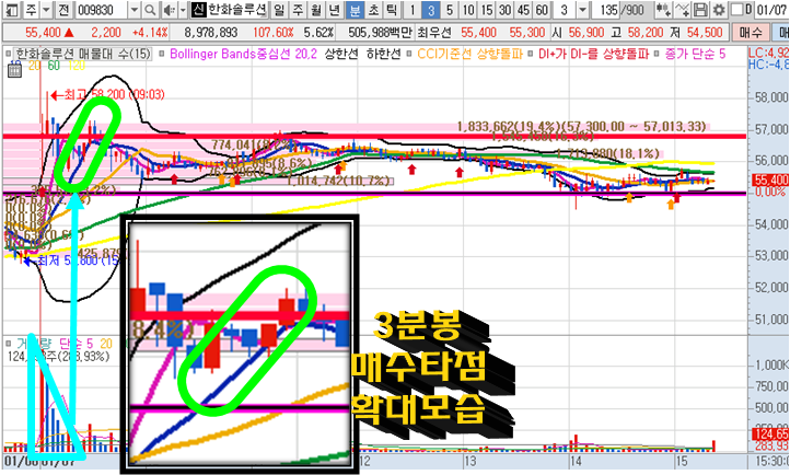 한화솔루션 3분봉 입니다. 시초가 공략종목으로 시초가 갭상승이후 10일선 눌림목 매수타점에서 6분안에 2.3%수익이 나왔던 종목입니다.