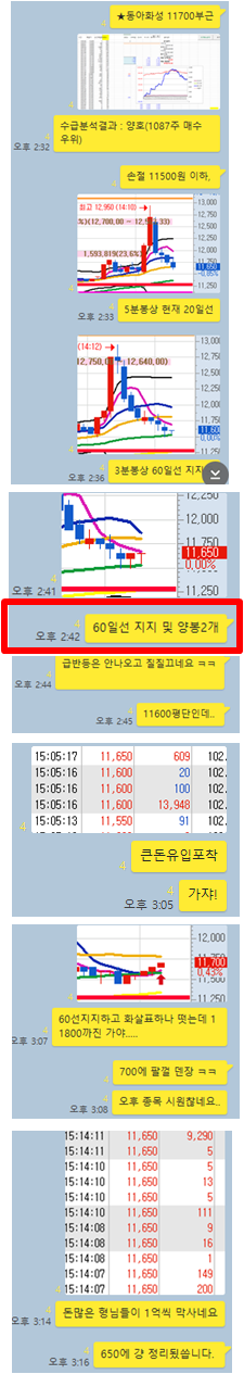 동아화성 3분봉 입니다. 오후공략종목으로 오후장 큰 급등이후 눌림목을 공략하기 위해 수급분석을 마치고 11700~500원 사이 매수타점으로 보고 600원 평단으로 맞춰놓고 기다리고 있다가 700원까지는 상승하는 모습이 보였으나 장 종료시간도 가까워지고 시원한 반등이 나오지 않아 한호가 위에서 정리한 종목입니다. 특히 수급현황이 외국인+기관이 양매수로 들어온상태라 추가적인 상승이 나오기 유리한 상황이라 보고 있습니다.