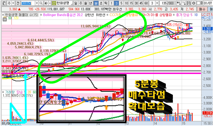 한화생명 3분봉 입니다. 오늘의 시초가 공략종목으로 시초가돌파는 바로 나오지 않았지만, 눌림목 주요 매매타점마다 반등이 나와주며 장중 최고 무려 29%이상 급등이 나왔던 종목으로 아쉽게도 상한가에 진입을 하지는 못했지만 굉장한 종목을 9시3분부터 발굴하고, 적정매수타점을 알려주었습니다. 제 예상으로는 28%부근인 3400원 부근이 최고점으로 봤지만 그 이상 약간더 올라간적은 있으나 역시 그정도로 마감이 되며 장이 종료되었습니다.