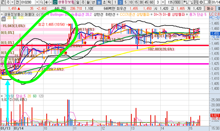 쌍용정보통신 3분봉 입니다. 어제 장마감 직전 스윙종목으로 추천한 종목으로 일봉차트와 분봉차트가 제가 굉장히 선호하는 모습이였기에 매수후 하루홀딩하고 3%이상의 수익이 실현되어 절반물량 정리후 홀딩중인 상태입니다. 일봉상 전일고점이 돌파될 확률이 매우 높았기 때문에 다음날 전일고점돌파가 나오면서 무난하게 수익을 챙길 수 있었던 매매하기 쉬운 종목이였으며 추가적인 상승세를 즐길수 있습니다.