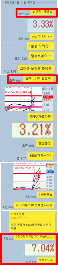오늘은 장전예상 종목 없이 시초가 공략종목 1개를 선정하였습니다. 특히 오늘은 단 하나의 종목으로 2번이나 수익을 실현하였으며 어제 공개한 스윙종목 또한 매매타점에서 수익을 실현할 기회가 있었습니다. 그럼 카카오톡 대화내용과 차트를 보면서 설명드리겠습니다.