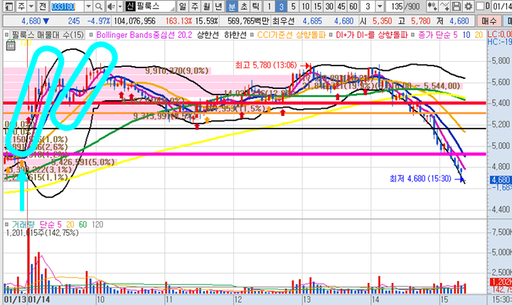 필룩스 3분봉 입니다. 어제의 상한가 진입이후 풀림없이 마감되었으며 시초가에 갭상승이 당연히 나와주었습니다. 9시부터 시작해서 진입후 3%수익 먼저 실현후 1분봉상 지지를 보며 5230원에 다시 매수신호를 주며 최종적으로 7%수익을 추가로 실현하였습니다. 그 이후 5분봉 10일선에서 다시 급반등이나왔지만 그때는 바쁜업무로인해 진입하지 못했습니다. 장막판에 다시보니 시초가에 그렇게 인기좋았던 종목이 급락을 한 것을 보니 역시 주식은 줄 때 익절을 잘해야 한다는 생각을 다시금 하게 되었습니다.