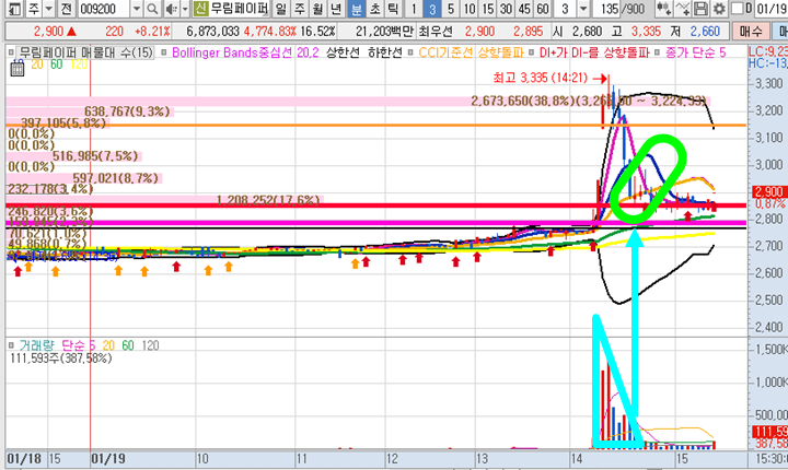 무림페이퍼 3분봉 입니다. 오후 공략종목으로 그 당시 무림그룹 관련주인 무림SP를 주축으로 무림페이퍼, 무림P&P가 초급등 상황을 보였습니다. 막상 그 당시 돌파로는 너무 겁이나서 진입하지는 못했고 눌림목에서 단 9분이내에 양봉3개를 확인하면서 2%이상의 수익으로 안전하게 매도할 수 있었습니다. 돌파관점으로 들어가면 이렇게 크게 수익이 날 가능성도 많지만 어디까지 오르고 급등후 급락이 오는 것을 모르기 때문에 차분하게 기다려서 최적의 매매타점에서 공략을하니 어쨌든 그 종목으로 수익을 보고 나올 수 가 있었습니다.