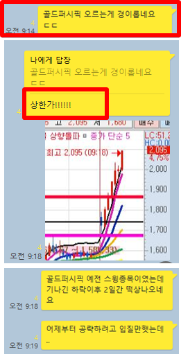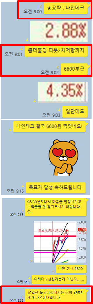 오늘은 장전예상 종목 없이, 시초가 공략종목 1+2개를 선정하였습니다. 특히 오늘은 공략종목이 돌파에 성공하며 쉽고 빠르게 수익을 실현할 수 있었으며, 오후 공략종목 또한 공개한 매수타점에서 바로 수익을 실현할 수 있었습니다. 그럼 카카오톡 대화내용과 차트를 보면서 설명드리겠습니다.