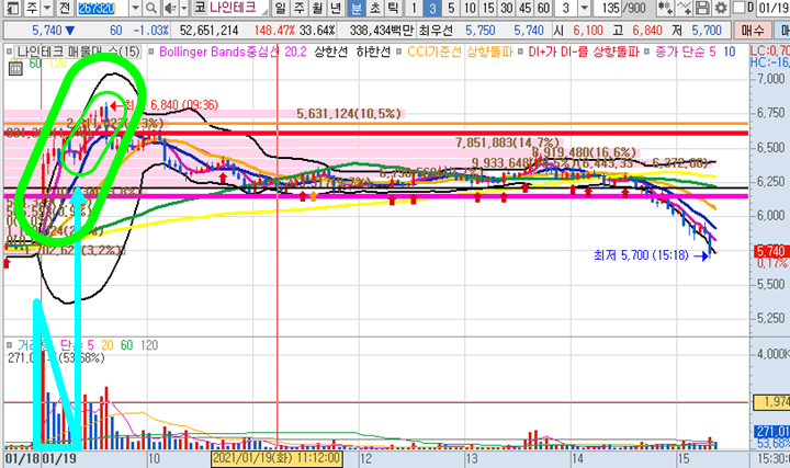 나인테크 3분봉 입니다. 오늘의 공략종목으로 시초가 돌파가 나오면서 단시간에 큰 급등이 나왔으며, 제시한 목표가 6600원을 쉽게 뛰어 넘으며 10일선 눌림목 매수 타점에서 다시 양봉5개이상 나오면서 장중 최고 6840원(약 18%)까지 상승이 있었으니 최초 6100원 대비해서는 12%이상 수익을 실현할 기회가 있었습니다. 최고 유리한 자리에서만 매매하고 수익실현이후 쳐다보지도 않았는데 장막판 최저가로 주저않으면서 마감되었으며, 주가가 활발하게 움직이는 아침시간에만 상대했기때문에 수익으로만 마감된 종목입니다.