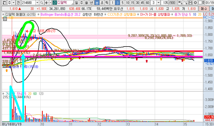 디알텍 3분봉 입니다. 시초가 돌파가 나왔던 종목으로 처음부터 눌림목 공략을 언급했었고 정확히 10일선에서 6분간 반등이 나오면서 해당 타점에서 2%이상 수익구간이 있었습니다.