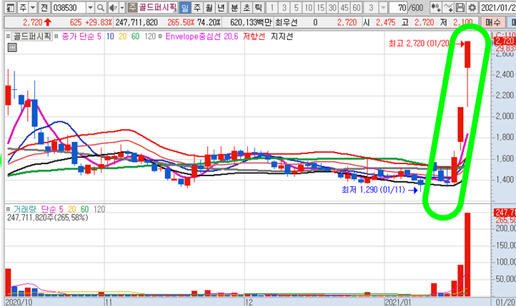 골드퍼시픽 3분봉 입니다. 과거 스윙으로 매매했던 추억의 종목으로 3일전 급등으로 상승추세전환이후 2일연속 상한가에 진입한 대박 종목입니다.