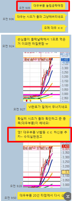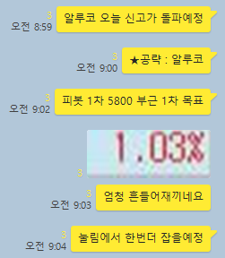 오늘은 장전예상 및 시초가 공략종목을 공통적으로 선정하여 짧은 1%수익 실현후 시초가 돌파 종목하나를 더 추가했는데 14%까지 급등이 나왔습니다. 또한 최근 공략종목이 상한가 및 급등현상에 대한 분석을 해봤습니다. 그럼 카카오톡 대화내용과 차트를 보면서 설명드리겠습니다.