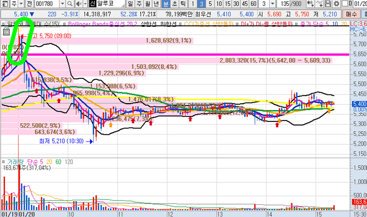 알루코 3분봉 입니다. 오늘의 공략종목으로 시초가 돌파가 나오지않으며 하루종일 하락한 비운의 종목입니다. 이 종목은 장전예상 & 시초가 공통종목으로 바로들어가도 수익확률이 높았습니다. 1분봉을 보고 단 1%수익을 챙기고 나왔는데, 과거에도 알루코는 시초가 공략을 하다가 물려서 추매하면서 고생을 한 경험을 생각해서 눌림에서도 한번더 다시 잡지않고, 빨리 도망나온 것이 천만 다행이라 생각합니다.