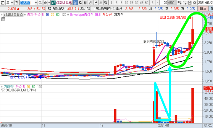 삼화네트웍스 3분봉 입니다. 최근 공략종목으로 키이스트와 동일하게 10일선 지지가 나오면서 다시 큰 급등이 나온 종목입니다.