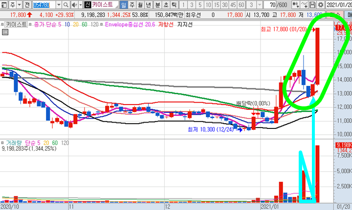 키이스트 3분봉 입니다. 지난주 언급한 종목으로 급등후 10일선을 지지하고 오늘 바로 상한가에 진입했습니다. 신규드라마의 라인업이 공개되면서 급등현상이 나오고있습니다.