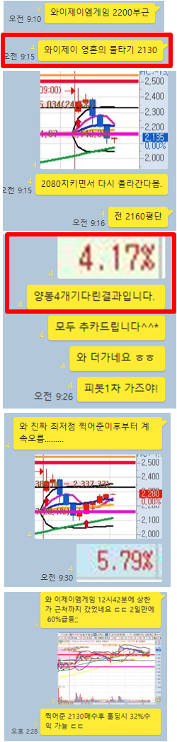 와이제이엠게임 3분봉 입니다. 오늘의 공략종목으로 시초가 돌파가 나오지 않으니 안전한 눌림목을 공략하기로 했으며 최초 2200원부터 2130원 영혼의 물타기까지 하면서 평단을 합리적으로 맞춰놓고 반등하는 모습을 즐겼습니다. 5~6%정도 최종적인 수익을 실현했던 종목이 장중 최대 29%까지 급등하면서 저를 아쉽게 하였습니다. 적어도 피봇2차저항까지만 들고 있었더라도 20%가까운 수익이 났을텐데 너무 빨리매도했습니다.