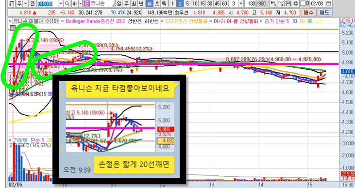 유니슨 3분봉 입니다. 시초가 공략종목으로 첫번째 캔들 돌파이후 4%가량 수익구간이 있었고, 그 이후 20일선 눌림목에서 다시 반등이 나오면서 다시 안전한 4%가량의 수익 실현구간이 있었습니다.