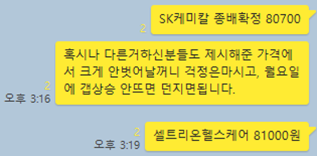 3시20분 전에 종배 확정금액을 공개 해드렸으며, SK케미칼은 80,700원 셀트리온헬스케어는 81,000원으로 결정하였습니다.