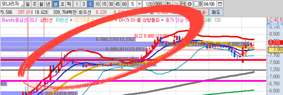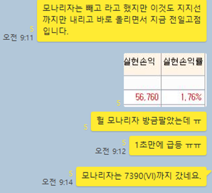 그러나 9시10분경 모나리자를 보니 지지하고 물량이 차곡차곡 들어오는게 전일고점이 돌파하면서 크게 시세를 줄 것만 같아서 저도 들어가서 2%미만의 수익으로 나왔습니다. 근데 정말 농담아니고, 나오자마자 몇초만에 피봇저항선까지 급등하며 저를 놀라게 하였습니다. 이게 바로 모나리자가 저한테 내리는 벌인가 싶을정도 였습니다.