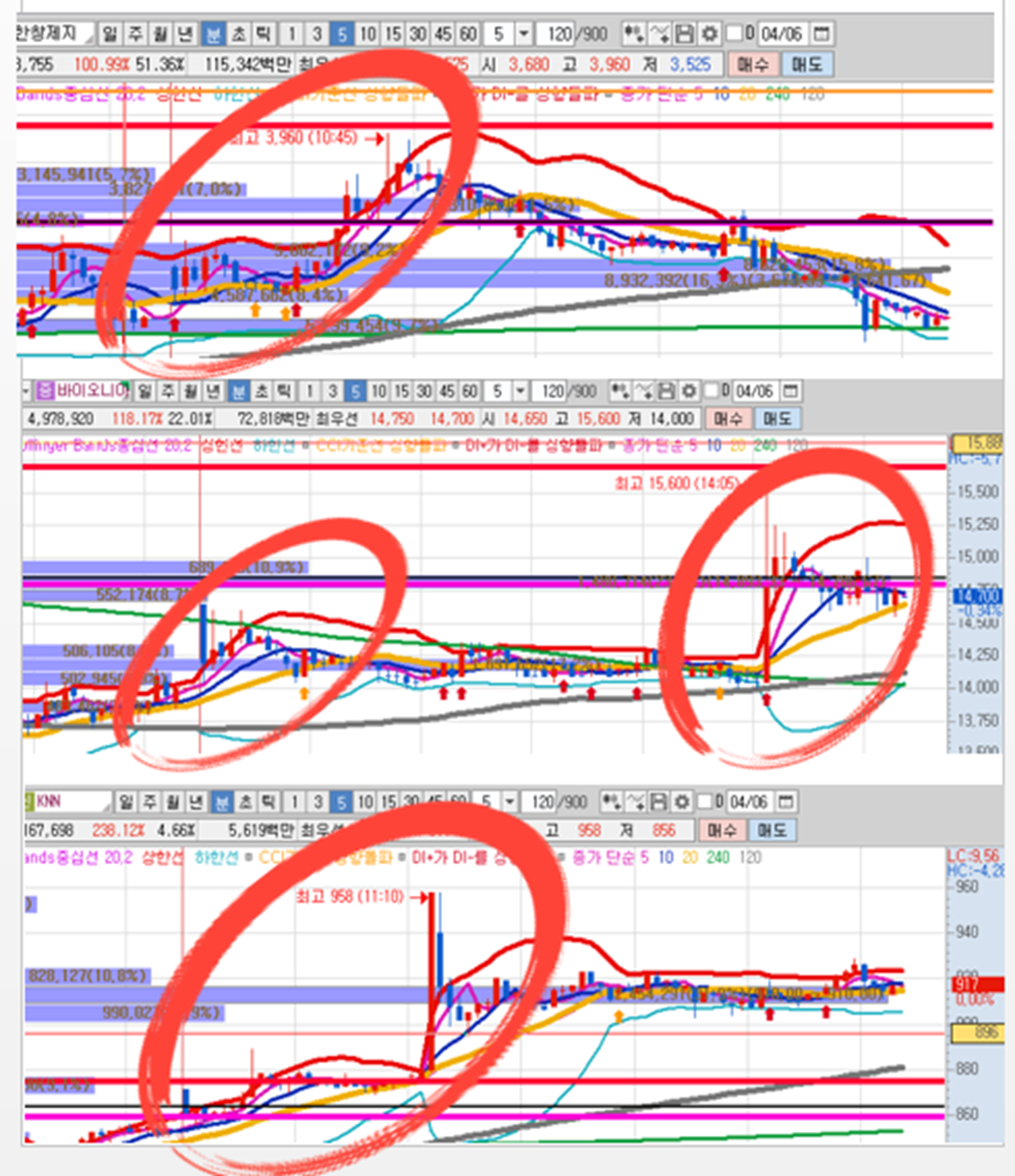 상기 3가지 차트는 순서대로 한장제지, 바이오니아, KNN이였습니다.