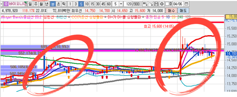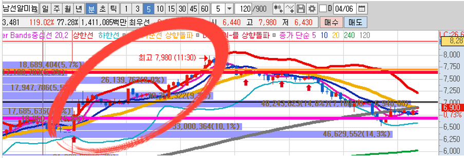 시초가 찾은 가격대비하여 엄청난 급등이 나왔습니다. 제가 항상 이야기드리는데로 거래량을 동반한 강한 종목의 경우 10시까지 계속 급등이 나올 확률이 많고 바로 사지않고, 눌림목에서 매매해도 여러번 수익이 가능한 구간이 나왔을 겁니다.