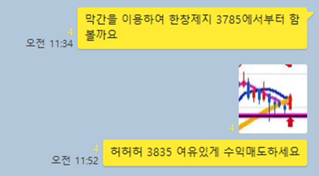 그리고 열심히 본업을 하다가 잠깐의 여유가 있어 주식창을 봤는데 마침 한창제지가 보였습니다. 제가 좋아하는 그 위치에서 지지하고 있길래...