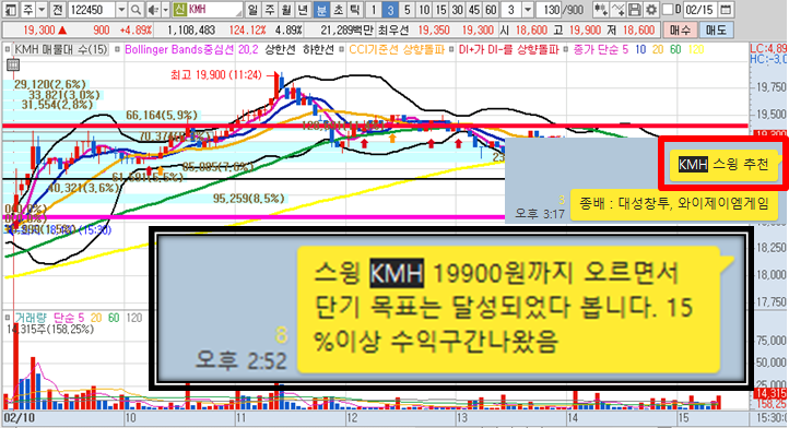 KMH 3분봉 입니다. 지난주부터 스윙으로 공략했던 종목으로 오늘 장중 최고 19900원까지 상승하며 단 며칠만에 20%가까운 수익이 나왔던 종목입니다. 일단 단기 목표는 달성되었다고 보고 종료하였습니다.