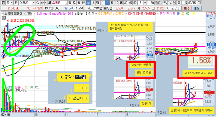 초록뱀 3분봉 입니다. 오늘 시초가 공략종목으로 갭상승 출발이후 침착하게 눌림목을 공략하였으며 10일선이 일시적으로 깨졌지만 20일선을 완벽하게 방어하면서 다시 피봇1차 저항까지 상승하며 2%가까운 수익구간이 있었습니다.