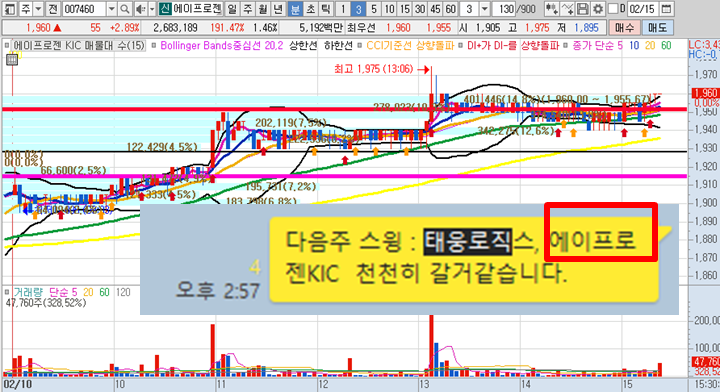 에이프로젠 KIC 3분봉 입니다. 연휴전 다음주 스윙으로미리 언급했던 종목으로 오늘 4%가까운 상승이 나왔습니다.