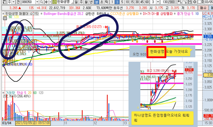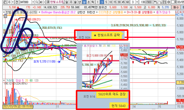 한빛소프트3분봉 입니다. 오늘의 시초가 공략종목으로 시초가에 큰 거래량이 터지면서 급등한 종목으로 2번째 캔들 돌파가 나올때 함께 합류하여 피봇2차저항 위에서 매도한 종목입니다. 21분만에 10%이상 급등이 나왔으며 20일선 타점에서도 다시 약 수익이 나왔습니다.