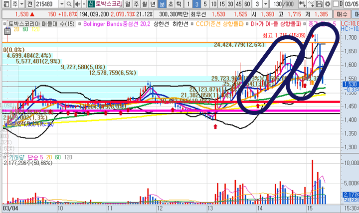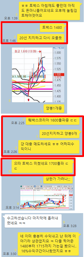 토박스코리아3분봉 입니다. 오후 공략종목으로 1480원 매수타점 제시 이후 1715원까지 급등하며 16%수익구간이 있었습니다.