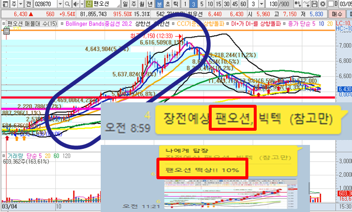 팬오션 3분봉 입니다. 장시작전 예상 종목으로 시작부터 서서히 상승하기 시작하다가 전일고점이 돌파되면서 본격적인 시세가 나오기 시작하면서 장중 최고 22% 부근까지 급등이 나왔습니다.