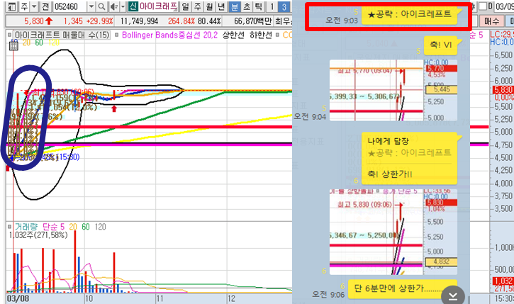 아이크래프트 3분봉 입니다. 오늘의 공략종목으로 2번째 캔들이 강하게 돌파하면서 장시작후 6분만에 상한가에 진입하였습니다. 그 당시 5480원 매수주문 넣어둔게 체결되지 않았고 상한가가 일시적으로 풀렸을 때 그가격에 다시 체결되면서 3%수익이 나왔는데 결국 다시 상한가 진입후 상한가 가격이 유지 된 상태로 마감되었습니다.