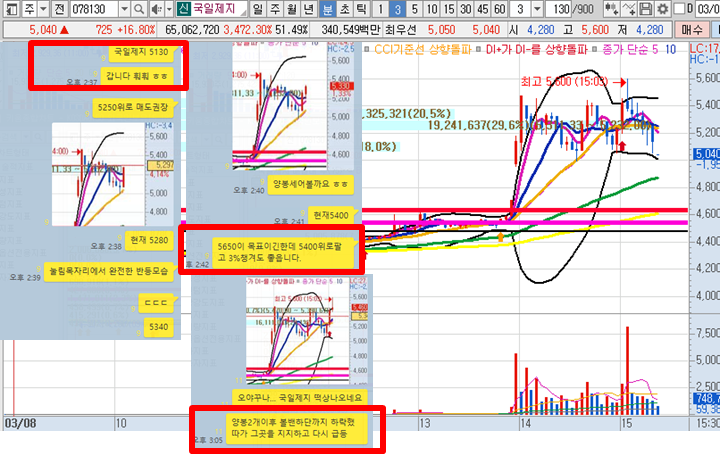 국일제지 3분봉 입니다. 오후공략종목으로 급등이후 20일선 눌림목 지지상황을 보며 매수타점을 5130원으로 잡았으며 선명한 양봉2개가 나오면서 6분만에 3% 수익매도를 할 수 있었습니다. 그 이후 하락을 하다가 볼린저밴드 하단을 정확히 지지하고 다시 급등하며 상한가 바로 아래호가까지 상승했었습니다.