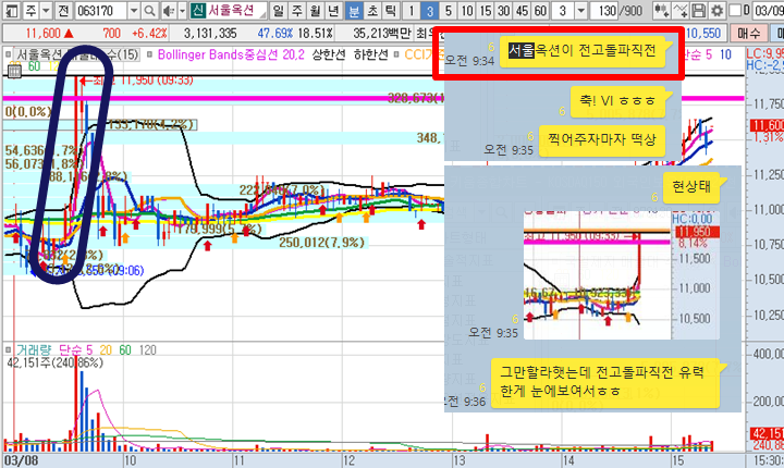 서울옥션 3분봉 입니다. 전일고점 돌파 직전에 발굴하여 급하게 매수해봤는데 매수하자마자 VI가 걸리면서 짧게 수익을 챙겼던 종목입니다.