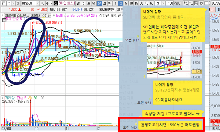 SBI인베스트3분봉 입니다. 시초가 좋은 출발이후 120선 부근까지 하락했지만 그 구간의 지지가 성공하면서 1600원까지 상승하여 최대 9%가까운 상승을 보였습니다.