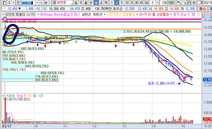 비덴트3분봉 입니다. 장전예상종목으로 선정하였으며, 첫번째 캔들이후 두번째에서 돌파가 나오지 않았으며, 5일선에서 짧은 반등이후에 횡보하다가 오후장에 볼밴 하단을 지키지못하고 급락이 나오며 마무리된 종목입니다. 일봉상 지지하는 구간인 11800원을 지키면서 다시 상승해야하는 종목입니다.