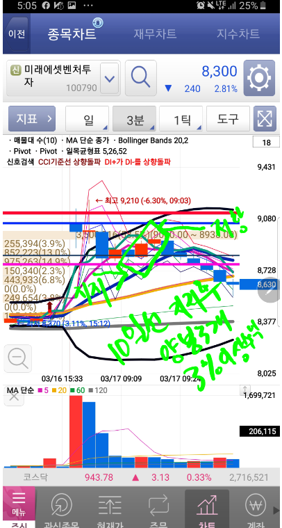 미래에셋벤처투자 - 10일선 지지후 양봉3개, 약 3%이상 수익 구간