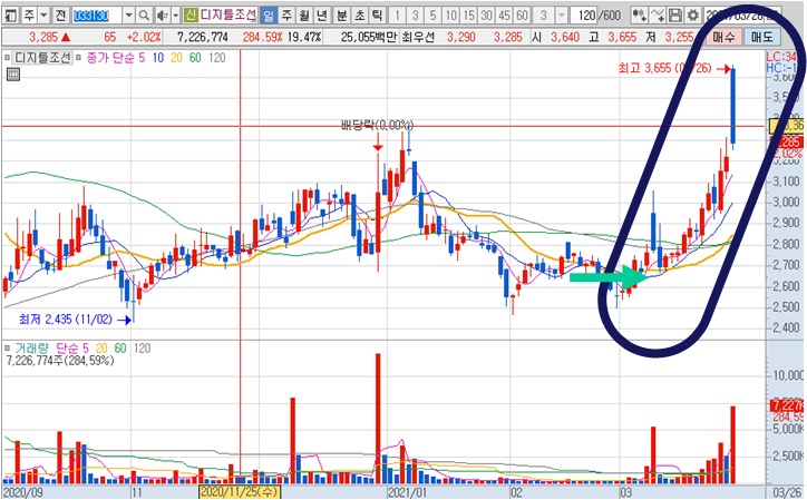 디지틀조선 3분봉 입니다. 2월 26일 스윙종목으로 추천하고 금요일 시초가 갭상승시 무려 50%가까운 수익구간이 나왔던 추천 종목이였습니다. 높은 확률로 한달 50%라면 스윙 투자를 충분히 할만 하지요^^