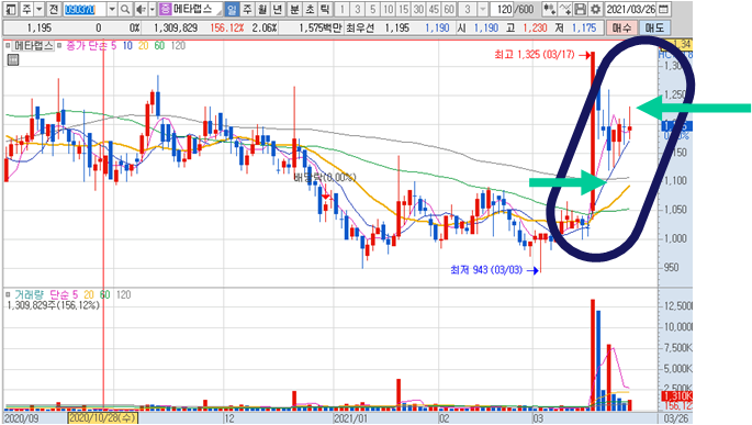 메타렙스3분봉 입니다. 최근 스윙종목으로 일봉상 10일선을 지지하면서 지속적으로 전일고점돌파를 갱신하며 상승추세에 있는 종목입니다.