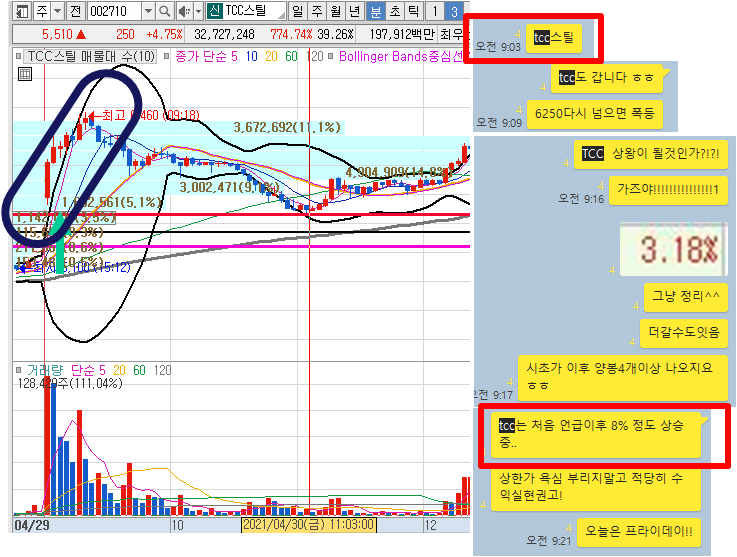 TCC스틸 3분봉 입니다. 시초가 공략종목으로 2번째 캔들 돌파 이후 볼밴상단을 올라탄 상태로 지속적으로 양봉이 나오면서 장중최고 23%가량 급등이 나왔습니다.