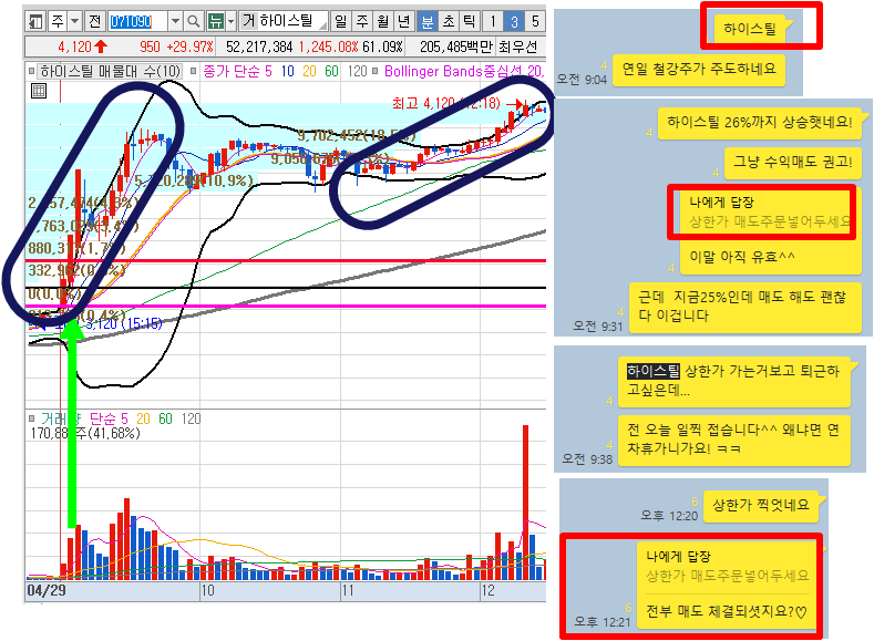 특히 오늘은 지수가 형편없이 빠진 날이였음에도 불구하고 당일 주도주인 하이스틸이 상한가에 진입했으며, 그 외 공개한 모든 종목에서 큰 수익이 있었습니다.