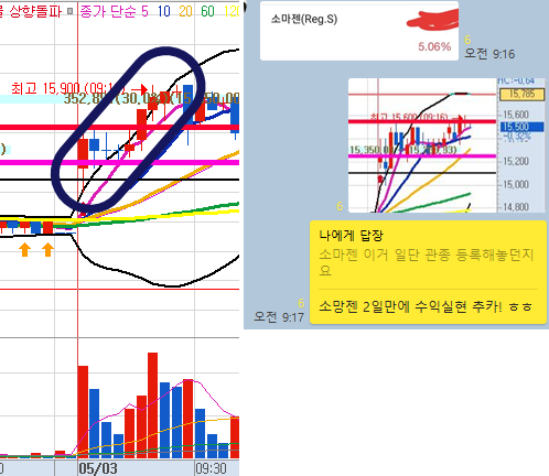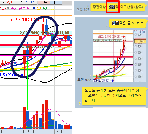 시초가 공략종목으로 2번째캔들에서 곧바로 돌파가 나오며 단 15분만에 15% 급등이 나왔던 대박 종목입니다.